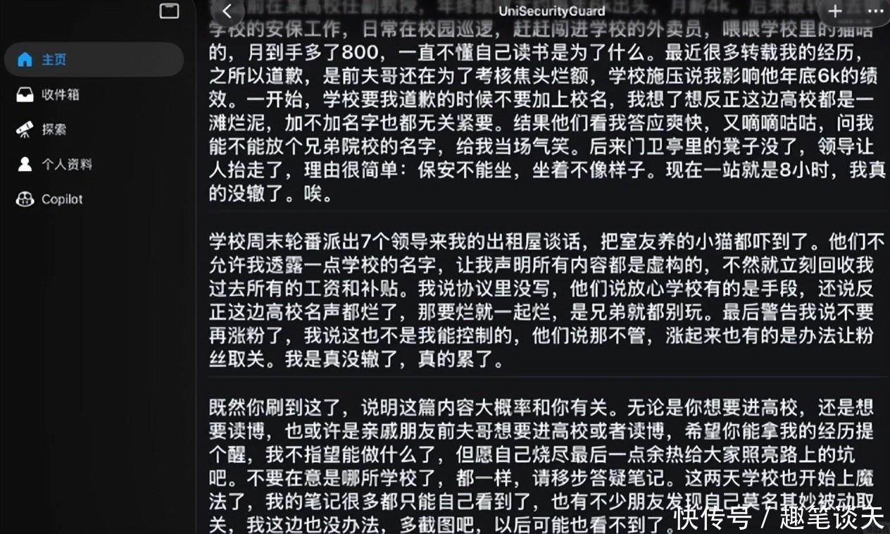 最近今天所谓浙江女教授转岗保安的内容再度火起来了。这次这个事情是从xhs上出现的,笔者很早就看过该作者的帖子,觉得就很不靠谱权威配资之家官网,所以一直也没对此发声。尤其是其作者名字为momo,而且屡次自称要曝光学校,甚至还说被校方约谈,然后就没了下文。