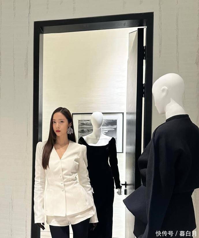下半身失踪式穿搭简直是显腿长标准穿搭!郑秀晶这次选择了白色西装裙,肩部设计凸显直角肩,让她看起来自带大女主气场,v领设计让她的脖颈看起来更加修长。