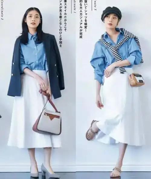牛仔衬衫和蓝色半身裙搭配在一起,既有学生时代的青春感觉,又带着一种复古随意的味道。牛仔衬衫有点工装风格,配上飘逸的蓝色半身裙,把腰线提高,一下子就能让腿显得又长又瘦,穿着它在城市里上下班,既舒服又帅气。