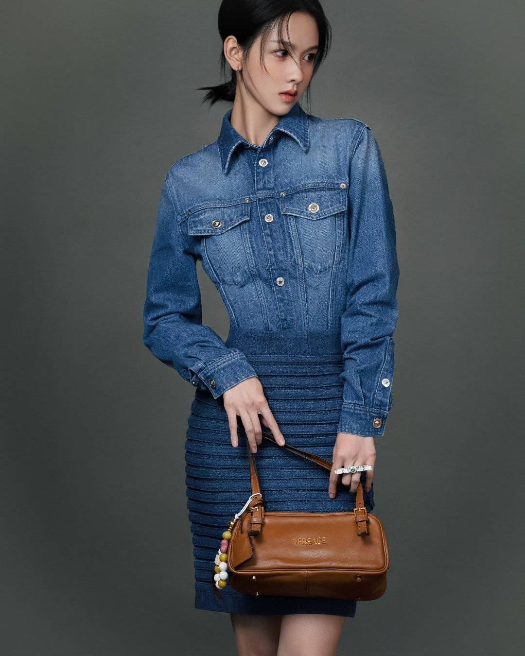 其实陈都灵的风格突破早就有迹可循。之前她穿旗袍是温婉的大家闺秀,走红毯时一身高定又成了优雅女神,这次换了牛仔裙配短款皮衣,突然就有了街头飒爽那味儿。港风的精髓不就是这种“矛盾感”吗?宽松的牛仔裙藏住胯部线条,高腰设计把腰线拉到胸下,再解开两颗衬衫纽扣露出锁骨,既保留了校园时期的清纯底子,又多了几分成熟女性的妩媚。难怪有人说,她这是把“港风穿搭公式”玩明白了——用基础款搭出记忆点,靠细节赢好感。